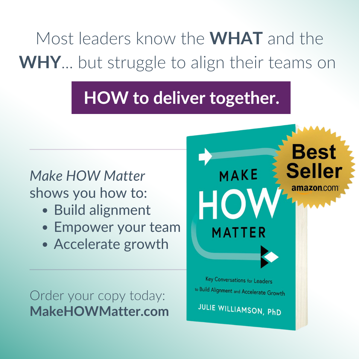 As the author of the best-selling book Make HOW Matter, Julie has written the definitive guide to leading as a team in a complex and fast-paced world. She'll take your audience through a series of conversations while providing them with inspiring and illustrative examples from her own 30+ year career in the corporate world. They will walk out with a better understanding of how they need to lead and work differently to transform their organizations. As Julie likes to say: